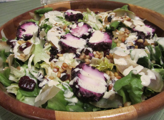 La scarole garnie de poires juteuses tranchées, de cerises séchées, de cœurs d'artichauts, de tranches d'oignon, de pignons de pin et d'un délicieux fromage de chèvre.