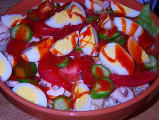 L’utilisation de viandes fraîches (ou charcuteries), de fromages variés et d’une vinaigrette classique joliment perchée sur un lit de légumes-feuilles glacés et froids vous invite à vous désaltérer, même par temps chaud et humide.Ajoutez ou enlevez ingrédients, (un must pour le vôtre), mais surtout, assurez-vous d'acheter les ingrédients les plus frais disponibles.Servez sur les verts de salade très bien réfrigérés, (souvent je jette quelques glaçons sur les laitues froides) avant Pour servir cela.Répainez les cubes, essorez l'excès d'eau, ajoutez les garnitures et arrosez la vinaigrette.Servez immédiatement.J'ai divisé la recette de vinaigrette en une recette séparée, qui; se trouve ici.Recette 360477.Parfois, je n'utilise qu'un simple pansement composé d'une partie de vinaigre de vin rouge et de deux parties d'huile d'olive extra-légère.J'ai également inclus le pansement au bas de cette page.Les deux ajouts sont merveilleux salade salubre.Adapté d'un chef à l'hôtel Ritz-Carlton de New York et prétendument inventeur du plat.
