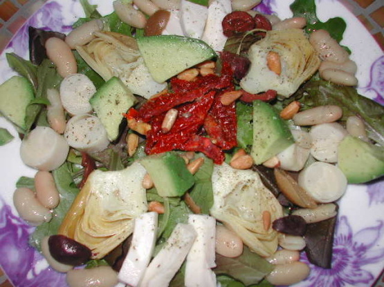 90 minLaituesartichaut, pétrole, gousses d'ail en quartiers, laitue pommée, des haricots, fromage, paume, Avocat, tomates, pignons de pin, Olives, citron, sel poivre,salade esotica -