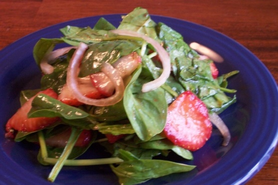 Dans un grand bol, mélanger les épinards, les fraises et l'oignon. Arroser de vinaigrette et remuer pour bien enrober.