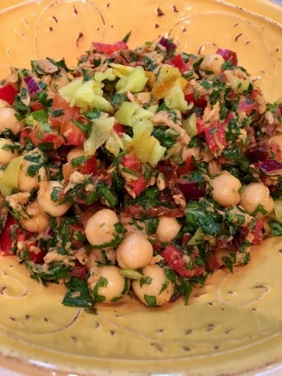 Salade garbanzo et thon à la coriandre, persil et poivron rouge