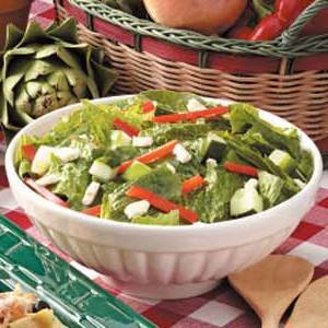 Dans un grand bol à salade, combinez la romaine, le poivron rouge et le concombre.Dans un pot avec un couvercle hermétique, combinez l'huile, le jus de citron, le sucre, le sel d'ail et le poivre; bien agiter.