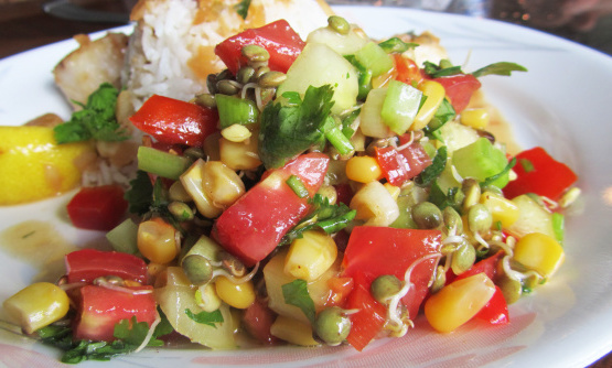Cela provient d'un article paru dans le magazine Common Ground.Si vous utilisez des lentilles germées, c'est 100% cru. Pour ce faire, vous devez évidemment planifier à l'avance. Les haricots noirs cuits / en conserve sont donc un excellent substitut. Cette salade est très saine, fraîche et a bon goût. génial! Servir immédiatement après la préparation ou réfrigérer jusqu'à deux heures.
