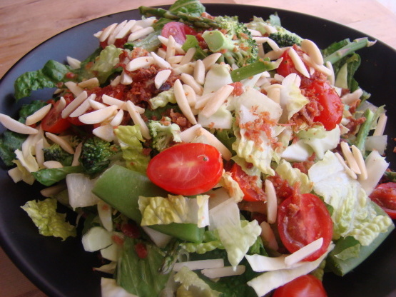 Ma famille a renversé cette salade légère et aérée que nous avions pour Pâques.DH aime les salades, mais pas les asperges et le brocoli. J'ai donc créé ceci pour que DH puisse manger plus de légumes verts.Il est retourné pour des SECONDES! Bien que la plupart des ingrédients puissent être ajoutés ou omis, il est important d'avoir une salade à base de romaine et de chou pour lui donner ce croustillant supplémentaire. J'aime la vinaigrette légère Aigre-douce, mais elle est également délicieuse avec la vinaigrette César. si vous aimez (pour les personnes à la diète, omettez les morceaux de bacon, les amandes et l'huile d'olive; la salade sera toujours délicieuse)