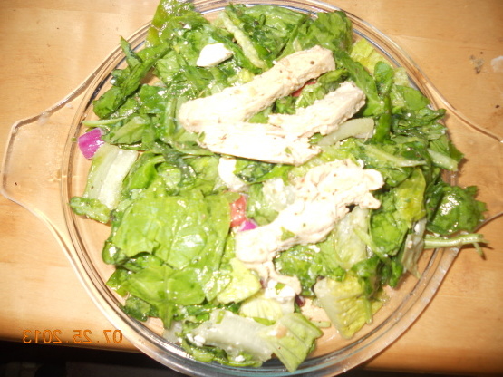 Mélanger la laitue, la tomate, le concombre, l'oignon, le tofu ferme, les olives noires et les épinards frais. Couvrir avec les lanières de poulet sans poulet cuites.