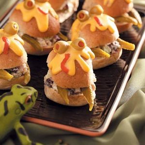 Chauffer la sauce au fromage pour qu'elle ramollisse; ajouter un filet ou une pipe au-dessus de chaque sandwich pour faire ressembler ses cheveux.Pour chaque sandwich monstre, fixez des olives pour les yeux, des lanières de piment pour le nez et des cornichons pour les crocs