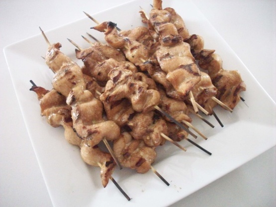 Cette recette provient du réseau Food Network et est attribuée à Emeril Lagasse.DH. Je l’ai servie comme l’un de nos plats à tapas pour une fête du Nouvel An et les invités en ont été ravis.Nous attendons avec impatience de la goûter plusieurs fois en été.Servir avec ma sauce aux arachides, recette 301105, également de chez Emeril.Le temps de préparation comprend le temps de marinage.Vous aurez besoin de 35 à 45 brochettes de bambou de taille moyenne (18 centimètres), trempées dans de l’eau pendant 15 à 30 minutes.