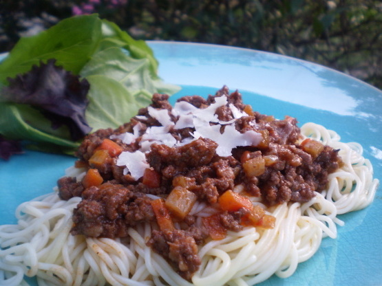 J'ai fait cette recette à partir de Paula du blog Bell'Alimento.Il est tellement délicieux que vous devriez l'essayer: /2009/10.1/bolognese-sauce/ Je ne connais pas vraiment le nombre de portions. Mais j'ai 2 pots de cette sauce.