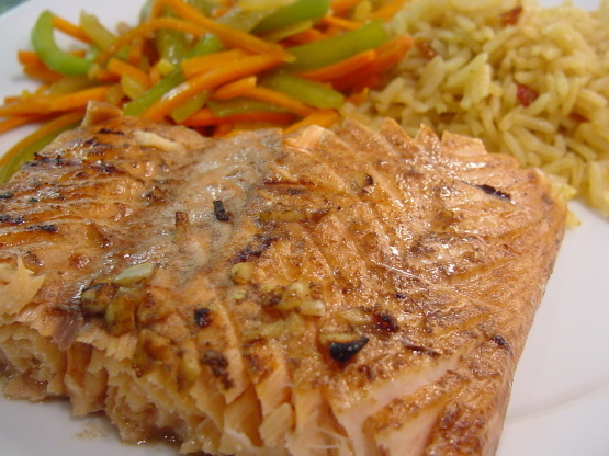 C'est un excellent plat à cuisson rapide du magazine Cooking Light.Lorsque je fais griller du saumon, j'utilise un panier à poisson vaporisé d'un aérosol de cuisson.Il est plus facile de se retourner sans casser les filets.