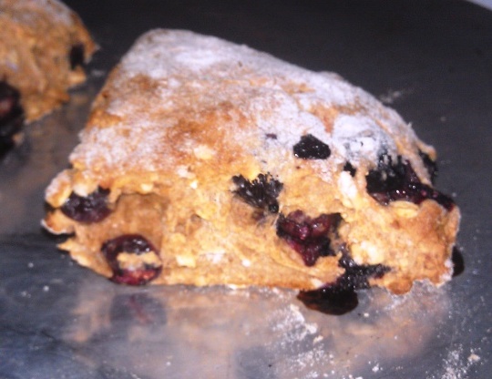 Inspirée de la recette 371363 de Lalalous, cette recette de scone simple est si facile que vous pouvez la préparer le matin avant le travail! Les framboises fonctionnent bien aussi - utilisez l'extrait d'amande si vous utilisez des mûres! J'utilise des baies congelées (celles qui sont congelées individuellement et non celles du sirop), et j'aime bien mes baies. Mon panier de baies ressemble donc davantage à un tas de 130 litres.