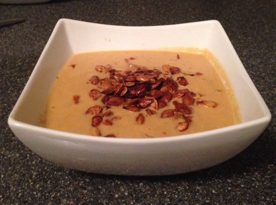 Servir la soupe avec des graines de citrouille grillées et du pain croustillant.