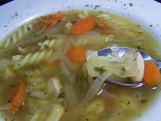 Cette soupe ne doit pas être confondue avec l'oignon à la française. Les oignons caramélisés ajoutés au bouillon de poulet lui donnent juste assez de saveur sans être envahissants. Ajoutez ce poulet rôti et, Mmmmm-Mmmmm, c'est bon.