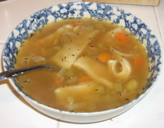 C'est un repas copieux MERVEILLEUX, spécialement pour un malade; la version végétarienne de la soupe au poulet et aux nouilles.Grand repas de soupe d'hiver. Vous pouvez toujours faire le bouillon dans la mijoteuse, le transférer sur le poêle et faire les boulettes quand vous êtes sur le point de manger. litre d'eau avec 2 œufs battus. Cela réduira le temps de cuisson de la boulette à 20 minutes à la plupart des altitudes.