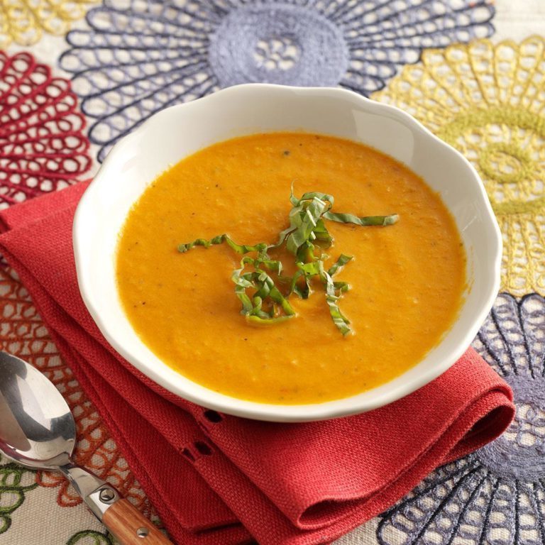 Dans un mélangeur, mélanger la soupe en plusieurs fois jusqu'à consistance lisse. Remettre le tout dans la casserole; chauffer à travers.Parnissez avec des feuilles de basilic si vous le souhaitez.