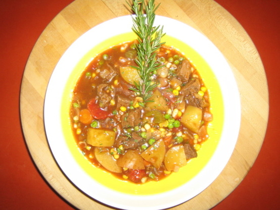 Ajouter les pommes de terre, les tomates, le maïs, les pois, les haricots verts et les herbes. Porter à ébullition et laisser mijoter à feu doux pendant 20 minutes à découvert. Retirer T-Bones, les feuilles de laurier et les jeter.