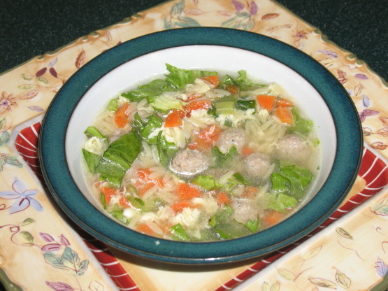 Après en avoir fait un temps ou trois, j'ai retravaillé les ingrédients pour les faire correspondre aux papilles gustatives de ma famille. Pour rendre le goût plus sain: réduisez la quantité de fromage râpé, utilisez de la chapelure non assaisonnée et un bouillon faible en sodium.Pour le rendre plus calorique utilisation conviviale: bouillon faible en gras, poulet haché ou dinde. Je déconseille de précuire ou de dorer la viande car cela changerait la saveur.Faites simplement vos petites boulettes de viande et placez-les délicatement dans un bouillon mijotant.Beaucoup de recettes appellent aux épinards, mais je trouve que la scarole ressemble, goûte et tient mieux. cela est assez fade à cause de l'option à faible teneur en sodium. S'il vous plaît, n'hésitez pas à lui donner du sel ou à utiliser un bouillon de volaille contenant du sodium, mais comparez les étiquettes, certaines peuvent être plus élevées que d'autres.