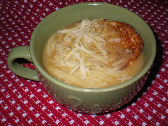 Placez une tranche de pain dans chacun des 6 bols à soupe; couvrir de soupe.