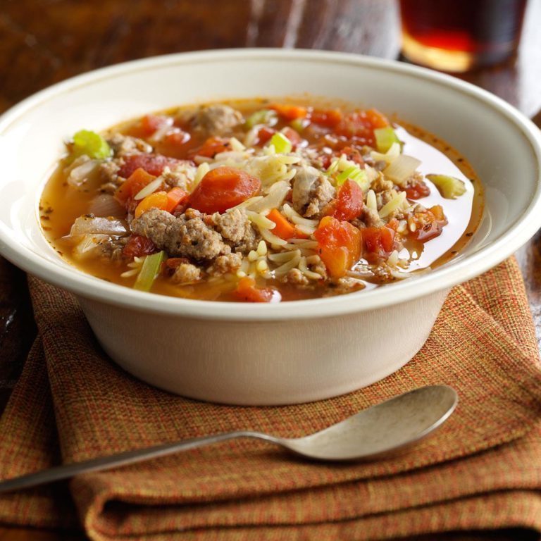 Cette soupe chaleureuse et réconfortante constitue un dîner réconfortant. Les herbes donnent à la cuisine une odeur merveilleuse! Si vous le souhaitez, vous pouvez utiliser des saucisses à la dinde moins caloriques pour la saucisse italienne.Je recommande d'ajouter 2 cuillerées à thé d'huile d'olive à la saucisse pendant la cuisson afin d'éviter qu'elles ne collent. — Kendra Van Doren, Clyde, Ohio