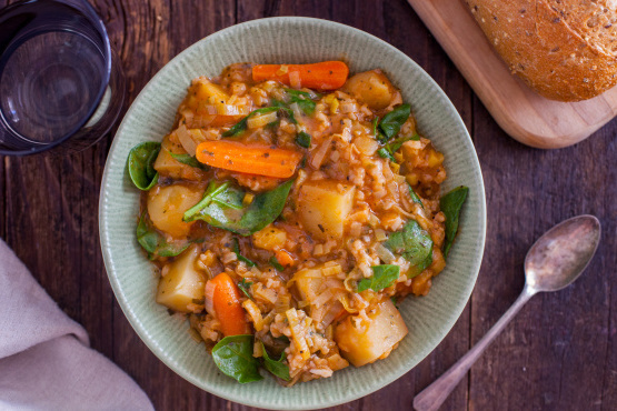 Soupe italienne de pommes de terre, riz et épinards dans un autocuiseur