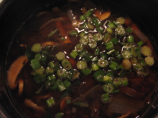 Ajouter le miso et laisser mijoter 2 minutes (ne pas faire bouillir après avoir ajouté le miso) .Garnir avec les oignons verts.
