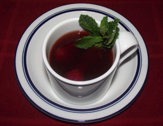 Placez les framboises au fond de la tasse et versez le thé sur les framboises. Incorporer la confiture, garnir du brin de menthe fraîche.Ajouter le sucre et garnir de crème fouettée, si désiré.