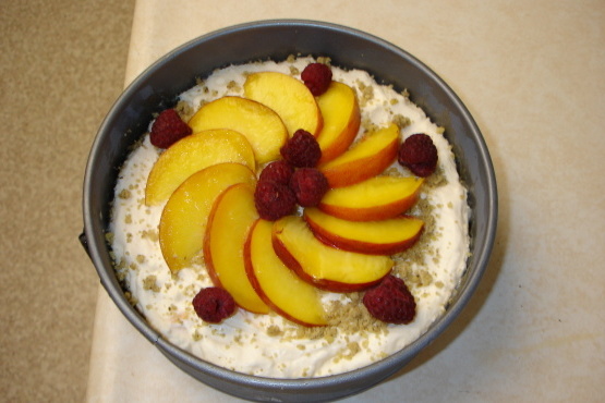 Au moment de servir, disposez les tranches de pêche sur le pourtour et placez-y le framboise et les noix réservées de façon décorative.