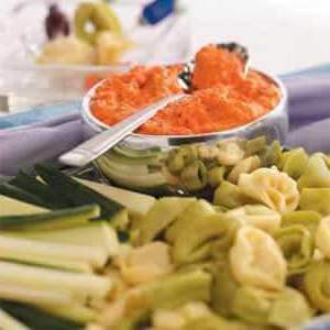 Égoutter les tortellinis; mélanger avec de l'huile. Servir avec des lanières de courgette et une trempette au poivron rouge.