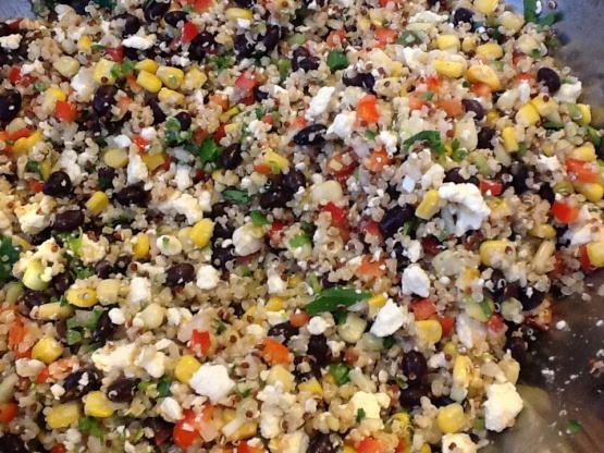 Cette salade unique n’est pas seulement belle, elle est délicieuse et nutritive. C’est mon point de vue sur la salade 'Stoplight'. Elle convient parfaitement comme plat d’accompagnement ou comme repas indépendant.J'ai utilisé un mélange de boulgour et de quinoa blanc et rouge (il est venu prémélangé dans une boîte) au lieu du quinoa et je suis heureux de pouvoir le faire.Vous pouvez aussi facilement utiliser que du quinoa.La texture et la saveur étaient fantastiques.Je vais également vous dire ici ce que je n'ai pas mis dedans, vous peut mélanger et assortir les ingrédients que vous préférez; 2 C tomates à pépins hachées et kalamata ou olives noires tranchées à 0,5 C. J'aurais ajouté les olives mais je n'en avais pas sous la main.Nous avons aimé cette salade et l'avions pour le déjeuner.