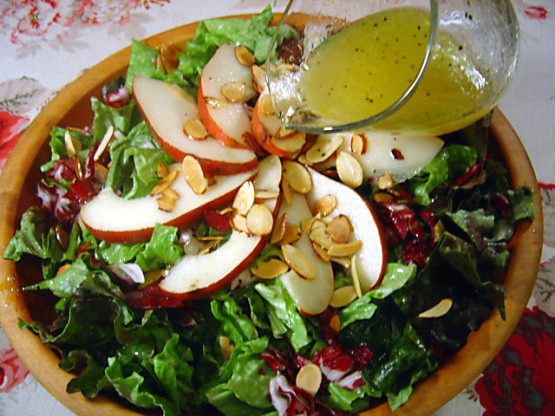 20 minVinaigrettesnoix, mon chéri, Poire Anjou, des légumes, fromage, Ail, pétrole, vinaigre balsamique, mon chéri, sauce Worcestershire, sauce sriracha sauce thai, poivre,salade maison mondiale -