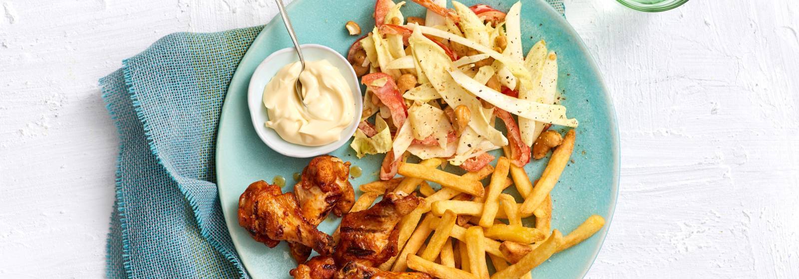Barbecue gousses de poulet avec frites et salade de chicorée