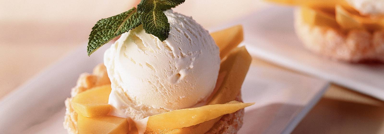 Une recette savoureuse. Le dessert végétarien contient les ingrédients suivants: mangue, coquilles à pâtisserie (4 morceaux) et glace à la glace (contenant `1 litre).