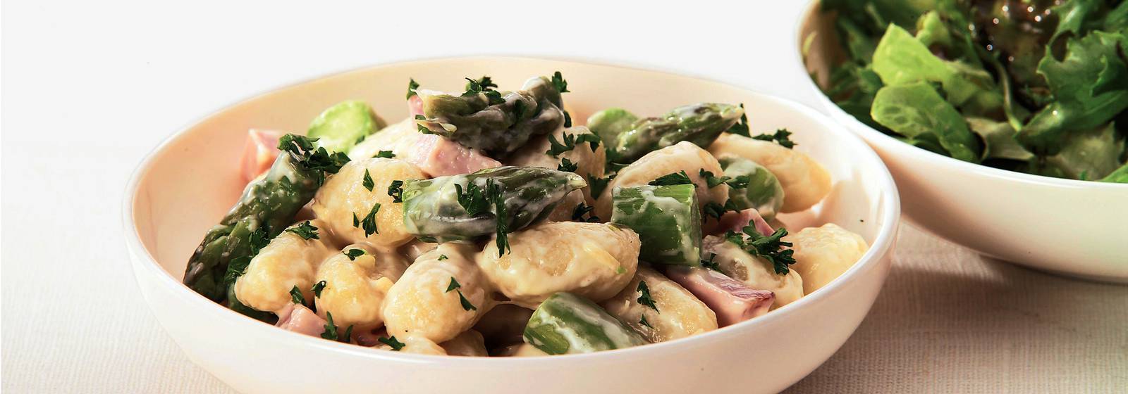 Une recette italienne savoureuse. Le plat principal contient les ingrédients suivants: viande, gnocchi di patate (boulettes de pâtes aux pommes de terre, 500 g), asperges vertes (500 g), jambon (environ 200 g, service), crème fraîche (125 ml), fromage râpé (30 ( 100 g), persil frais (30 g), lamellange de feuilles de chêne (100 g) et vinaigrette balsamique.