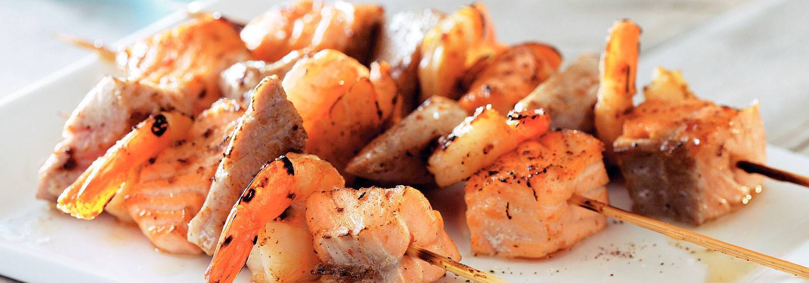 Couper le thon et le saumon en gros morceaux et les badigeonner de gambas aux brochettes.