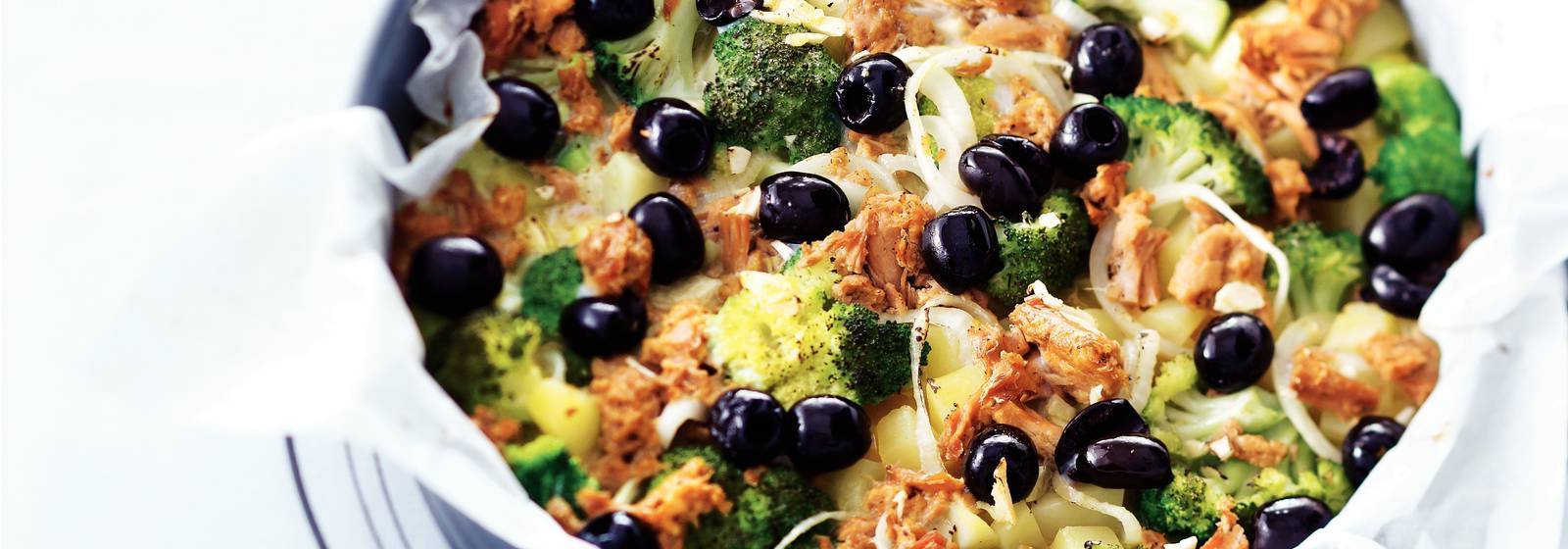 Une recette savoureuse. Le plat principal contient les ingrédients suivants: poisson, pommes de terre (pelées, pelées), brocoli (en petits fleurons), huile d'olive, oignons (en rondelles), thon (en huile d'olive (a 160 g), égoutté), olives noires (sans pépins). pot 240 g)), œufs et ail (hachés finement).