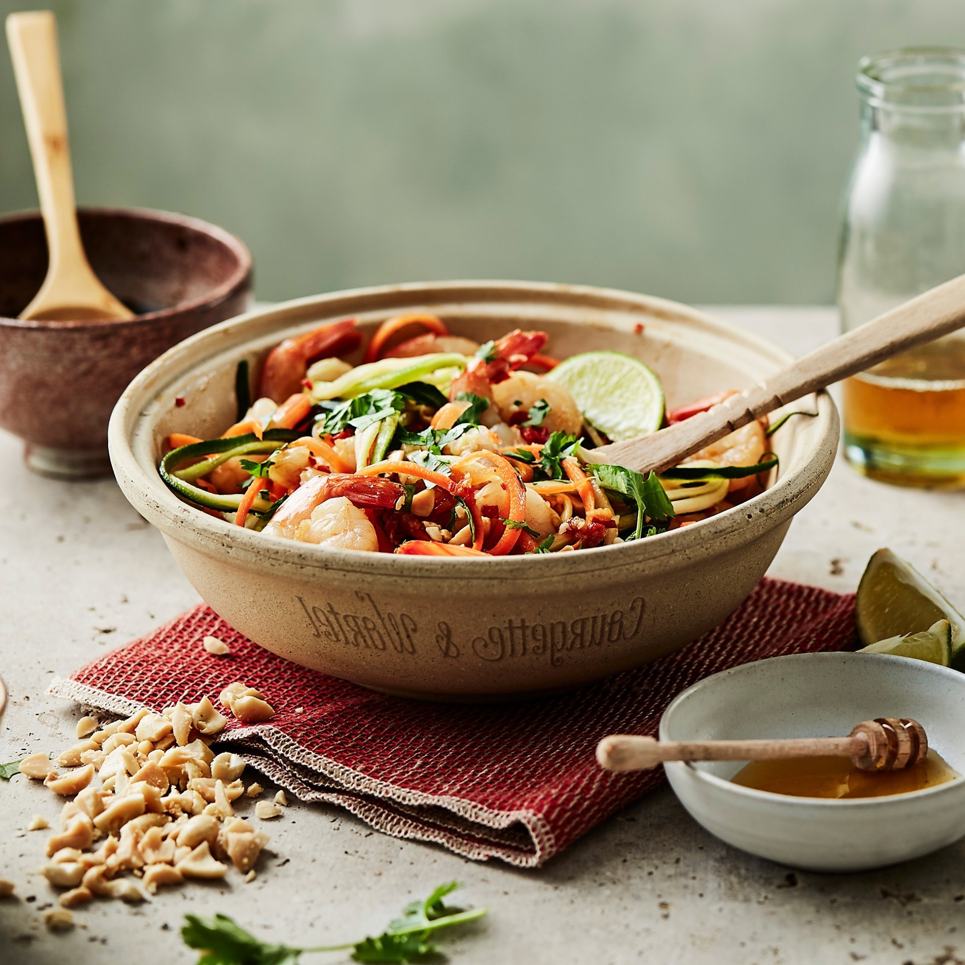 Ajouter les crevettes et cuire environ 2 minutes. Ajoutez ensuite les rubans de courgettes et de carottes, laissez cuire 2 minutes, salez et poivrez.