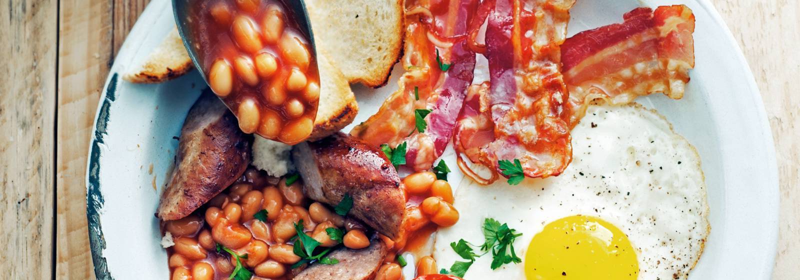 Petit-déjeuner anglais avec saucisse, bacon, tomate de vigne, haricots blancs à la sauce tomate, pain blanc et œuf.
