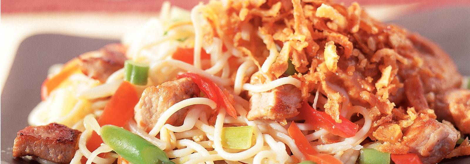 Une recette savoureuse. Le plat principal contient les ingrédients suivants: viande, huile de tournesol, nasi / bamivlé (environ 450 g), mélange de légumes chinois (400 g), nouilles (500 g), sauce soja, sauce satay (350 g) et oignons frits g).