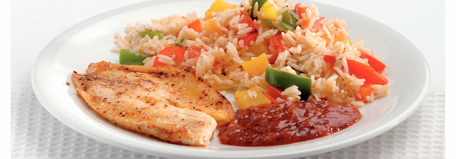 Une recette savoureuse. Le plat principal contient les ingrédients suivants: poisson, riz blanc, assaisonnement cajun (un pot de 50 g), huile de maïs, filet de tilapia (poisson, environ 400 g), poivrons trois couleurs, tomates, vinaigre, sucre, moutarde et steak et sauce au grill ( pot a 350 ml).