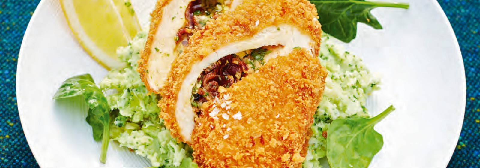 Répartissez la purée sur les assiettes et posez-y un Kiev.