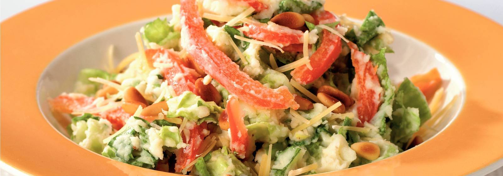 Ajoutez les pignons de pin, les poivrons, le fromage et les endives à la purée et remuez bien. Assaisonner avec du sel et du poivre.