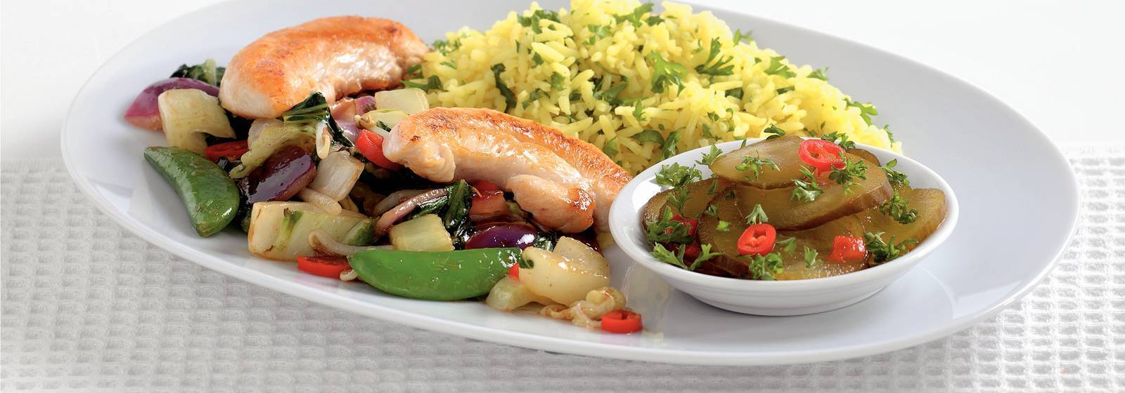 Une recette savoureuse. Le plat principal contient les ingrédients suivants: volaille, riz jaune (325 g), persil frais (30 g), poivron rouge (sachet de 2 pièces), salade de concombre (340 g), huile de tournesol, fromage (environ 340 g) , légumes au wok (750 g) et sauce au wok (cinq épices (bouteille de 175 ml)).