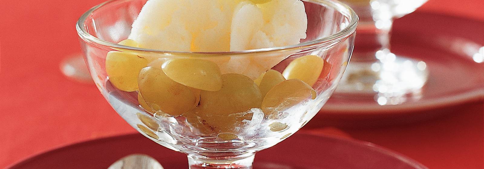 Laver et couper les raisins en deux. Divisez la moitié en quatre sections. Ajoutez de la crème glacée absorbante avec une cuillère à crème glacée ou trempez-la à la cuillère dans de l'eau tiède. Décorer avec le reste des raisins.